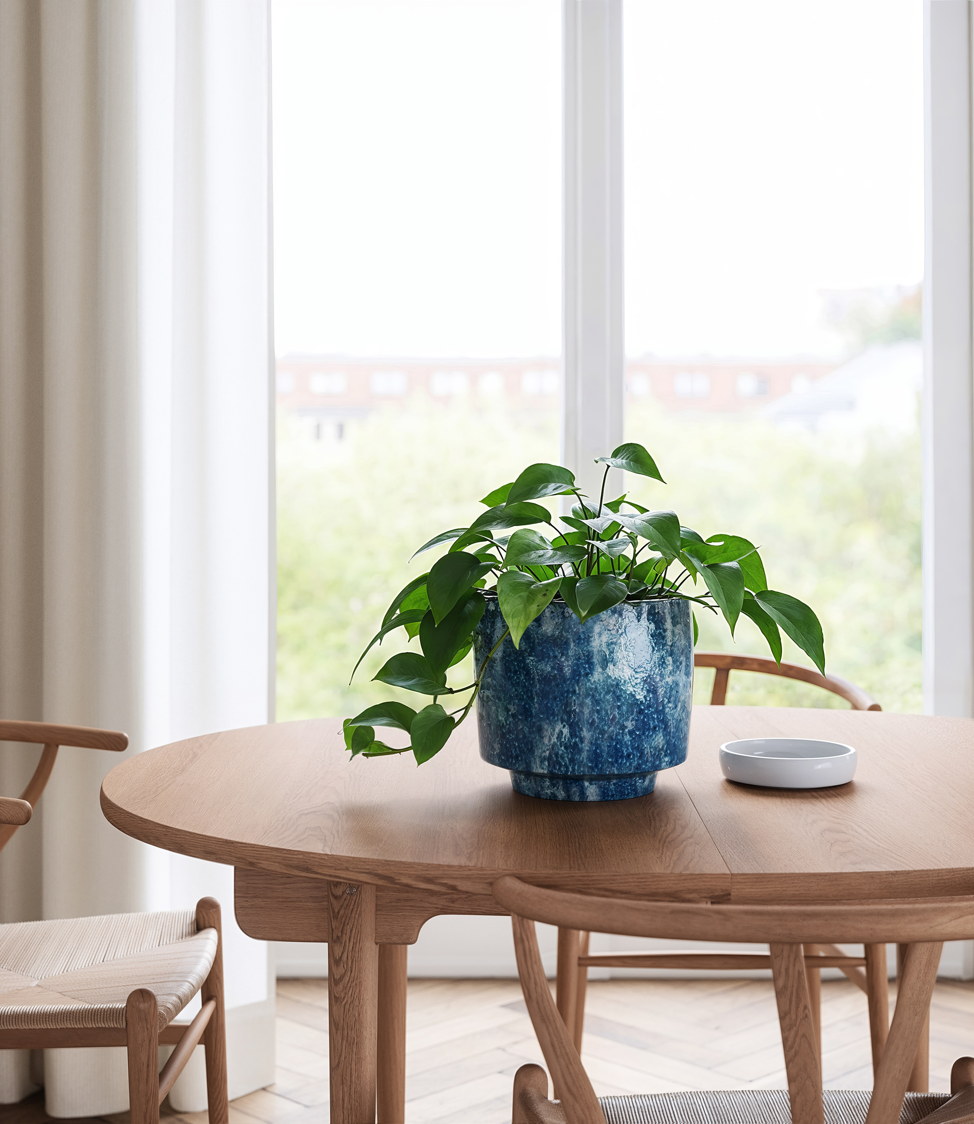 Vaso de cerâmica artesanal com acabamento vidrado e produzido por artesãos locais. Adequado para espaços interiores, com capacidade de 6,3L. Complementável com vaso de produção. Produzido em Portugal.