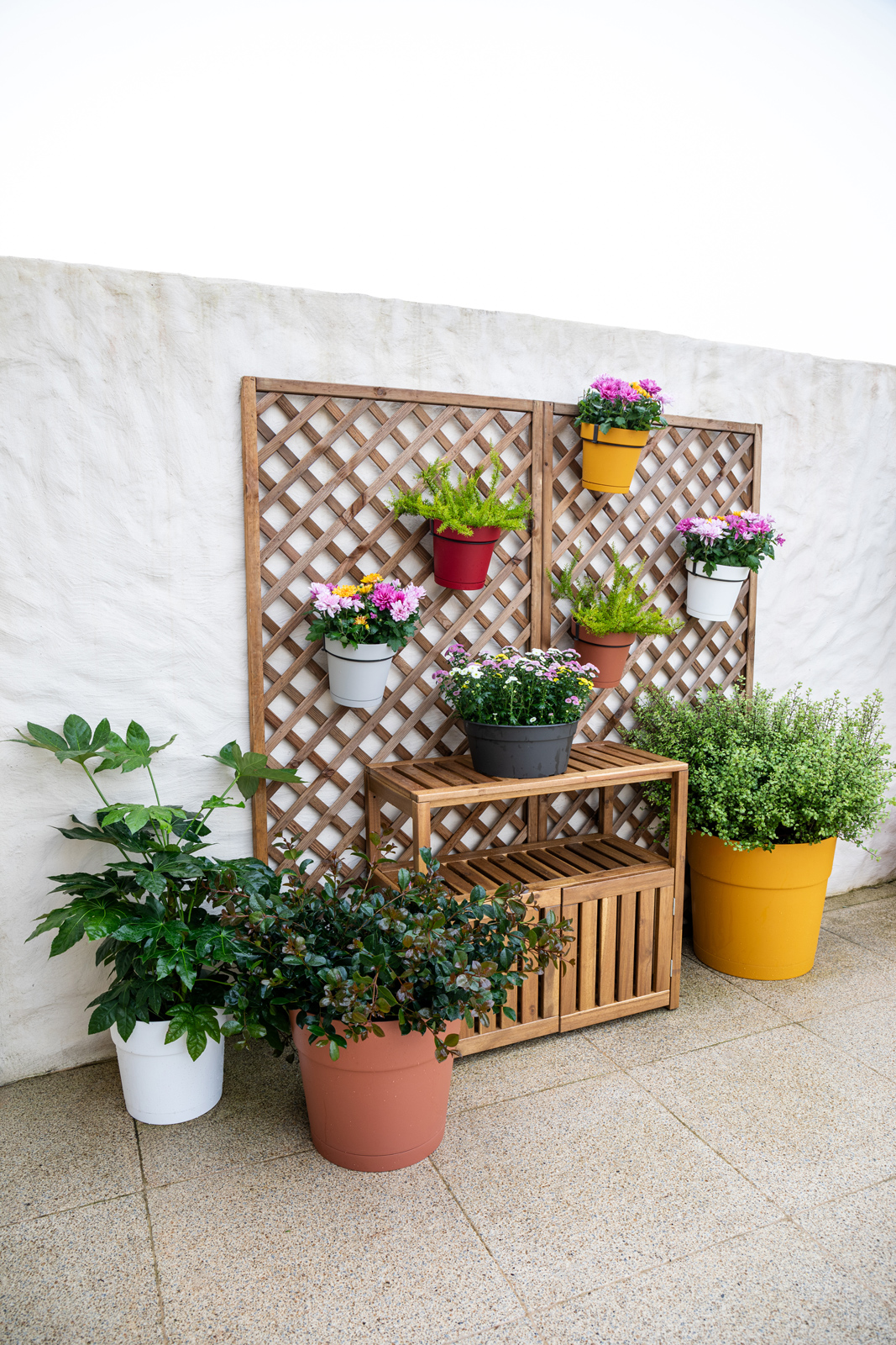 Kit de vaso de plástico reciclado para varanda, fabricado em polipropileno, leve, durável, reciclável e reutilizável, com proteção UV, à prova de gelo e com orifícios para drenagem. Inclui suporte de ferro, para aplicação na varanda. Inclui prato com clipes, para reserva de água. Adequado para espaços exteriores, com capacidade de 4L. Produzido em Portugal.